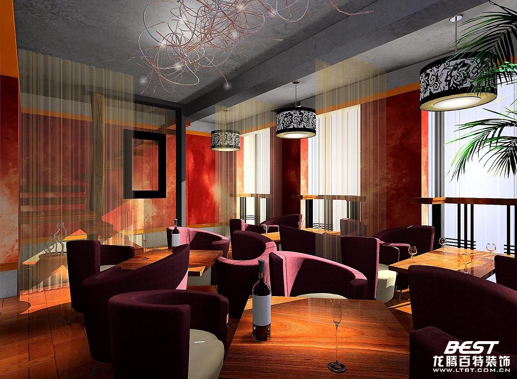 在咖啡廳的設計中,局部照明設計和應用是燈光設計的靈魂。總體的空間的照度不要求很高,以職員能夠正常流動的最低照度為準,把精力放在刻畫細節(jié)的局部照明上。每組插座應該有一組燈管,最好是帶燈罩的燈光,或類似燭炬的照明范圍不大的燈光,而且多采用暖色燈光,為喝咖啡人創(chuàng)造一個溫馨、私密的空間。充分利用光影的作用是咖啡廳照明設計的另一個特點,可利用這個特點有意制造出一些浮泛,并把燈光放進去或放在某些植物的下面向上照射,使空間產生有趣的光影,既豐碩了視覺效果,又增加了空間的立體感和層次感。