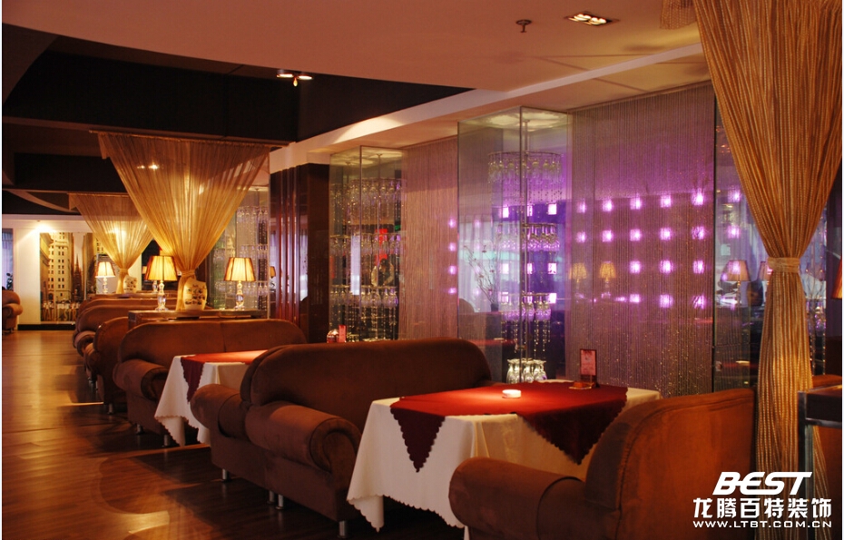 咖啡廳的空間設計要與其總體設計風格相匹配。在空間布置上可通過虛的手法遮擋視線,似隔非隔,隔中有透,實中有虛。例如利用布慢、漏墻、珠簾、屏風、籬笆、木柵等緩沖通道與視線;又如,利用通道的回繞曲折相通,不使人一目了然。適當?shù)姆指暨€可知足部門客人不想被打攪的心理,這就是所謂的“園必隔”。